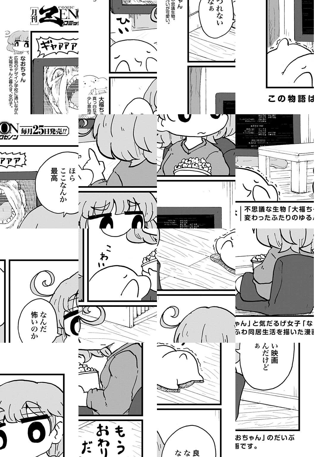 『大福生活』とは、不思議な生き物「大福ちゃん」と気だるげ女子「なおちゃん」が贈る、だいぶ変わったふたりのゆるくて、ていねいな同居生活の物語です。