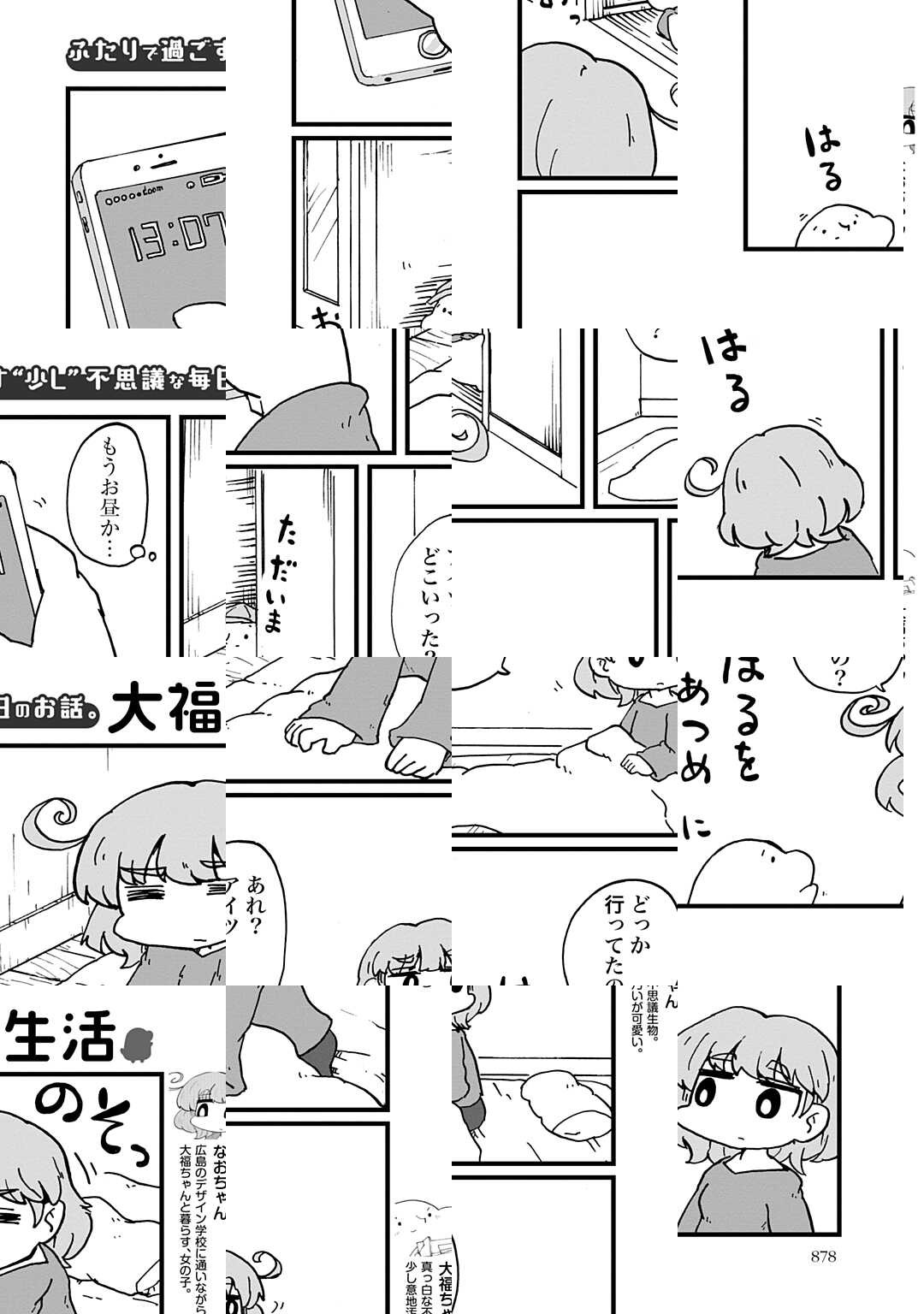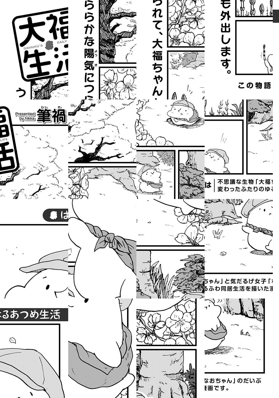 『大福生活』とは、不思議な生き物「大福ちゃん」と気だるげ女子「なおちゃん」が贈る、だいぶ変わったふたりのゆるくて、ていねいな同居生活の物語です。