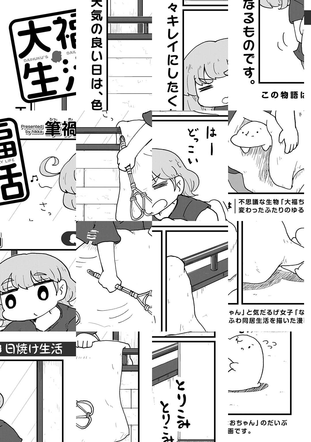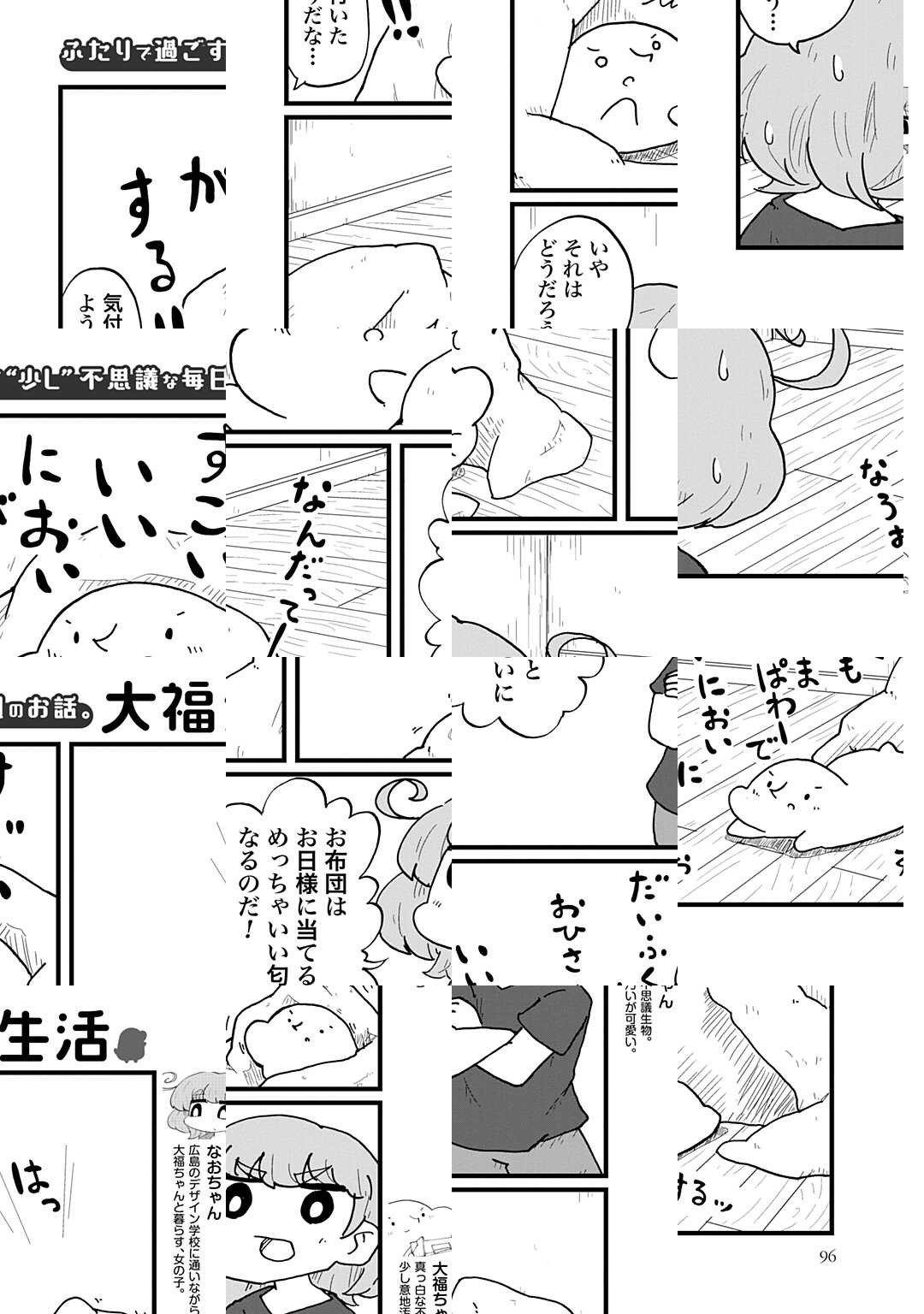 『大福生活』とは、不思議な生き物「大福ちゃん」と気だるげ女子「なおちゃん」が贈る、だいぶ変わったふたりのゆるくて、ていねいな同居生活の物語です。