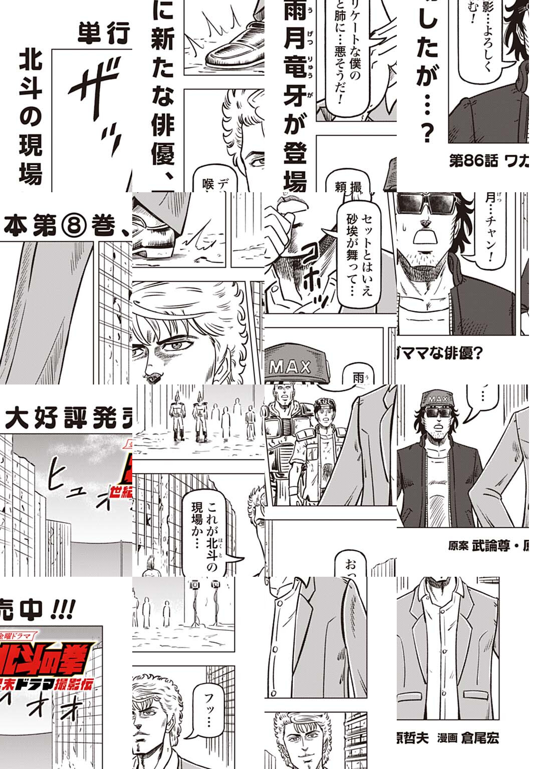 時は世紀末。 海は枯れ、地は裂けた世界。 弱きを傷つける悪に立ち向かう革ジャンの男。 敵を華麗に倒す姿に大きな叫び声が重なる。 「カーーーット!」 枯れた海も、裂けた地も大規模なドラマセット。 これはドラマ『北斗の拳』を日夜撮影する者たちの血と涙と汗の記録。