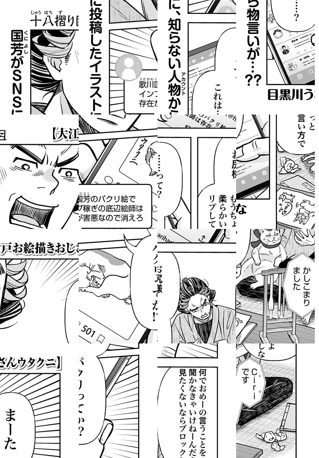 時は江戸後期。浮世絵師・歌川国芳は「武者絵の国芳」として、その名を馳せていた。版元にはとにかく売れる絵・武者絵ばかりを求められる国芳だったが、実のところ本人は大好きな猫の絵を描きたくて仕方がなかった。そんな折、不思議な喋る板・令和時代のスマートフォンを手に入れた国芳。それ以降、SNSにハマってしまって…!?
