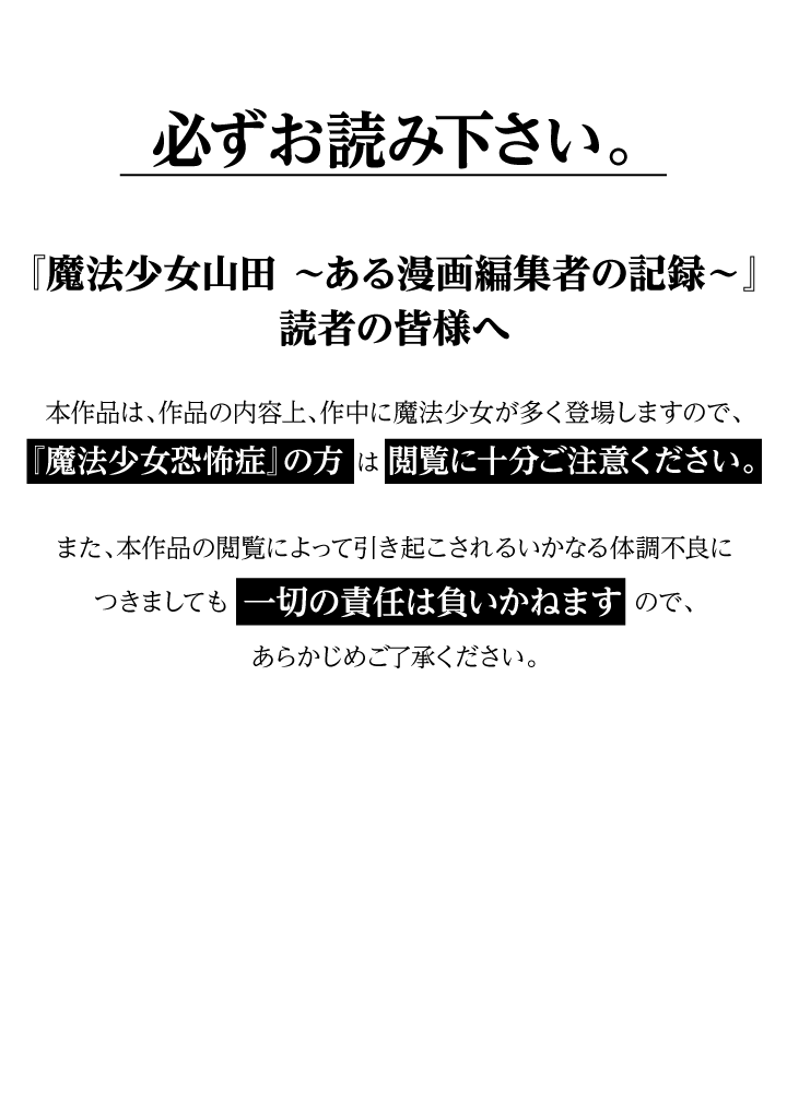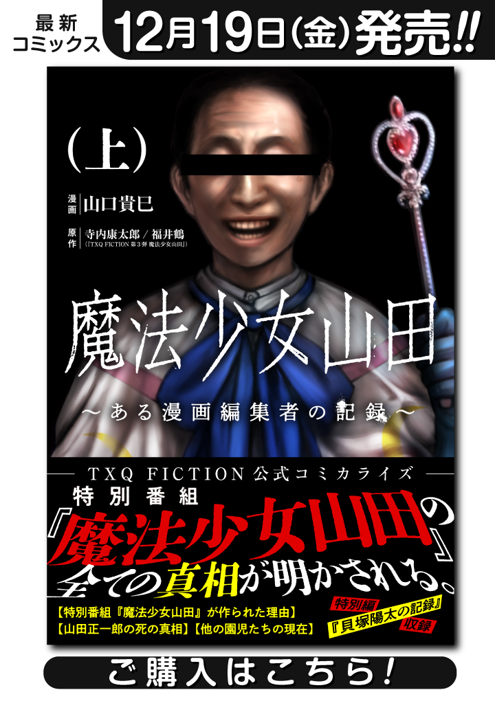 【『TXQ FICTION第3弾 魔法少女山田』公式コミカライズ】謎の魔法少女が出てくる夢を起因とした『魔法少女恐怖症』に悩まされる漫画編集者の佐藤。だがある日、佐藤は夢に出てくる魔法少女によく似た絵が描かれた漫画と出会う。恐怖症の原因を探るために、その漫画の作者に連絡をする佐藤。しかしそれは、暗く深い絶望への入口だった──。