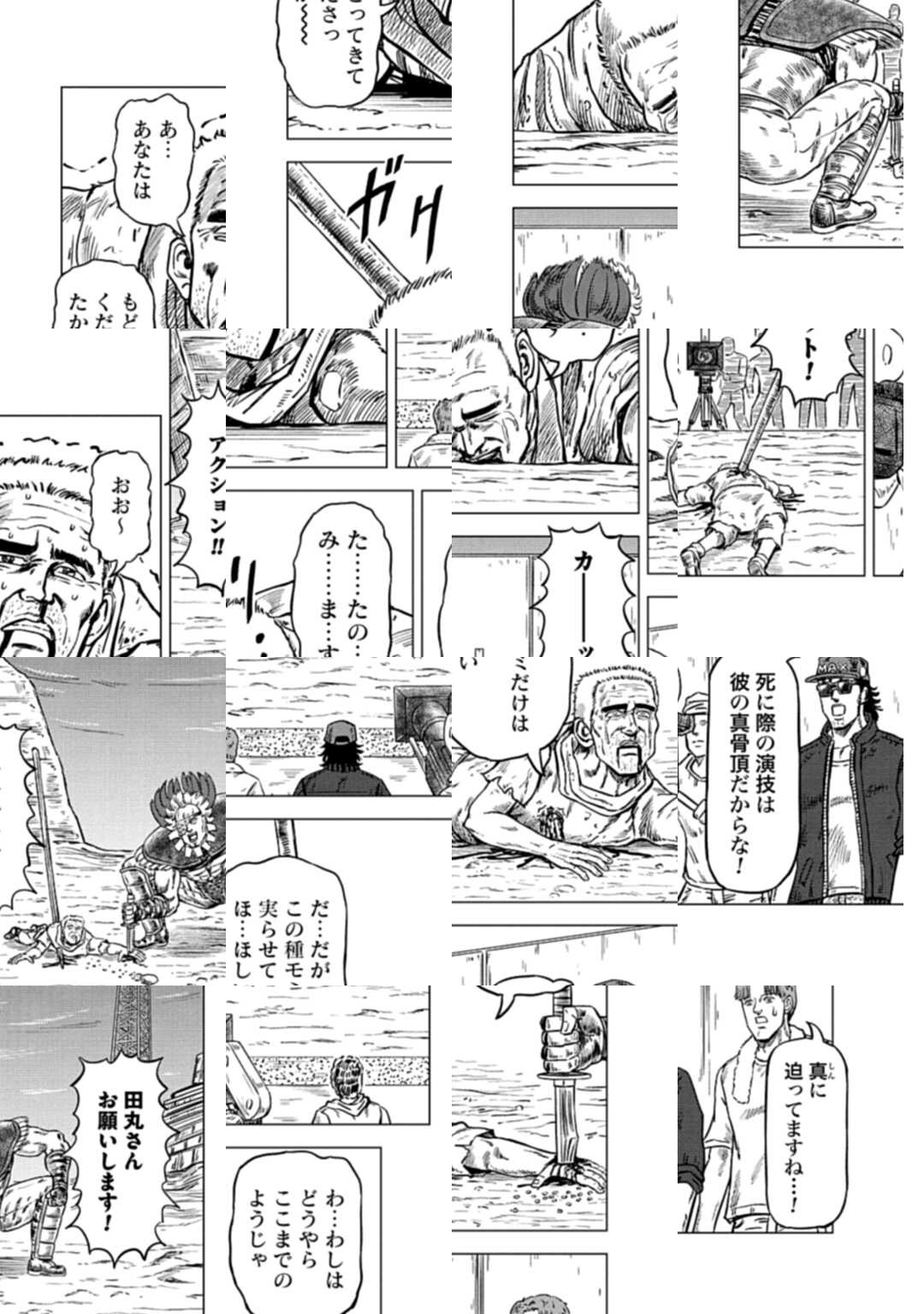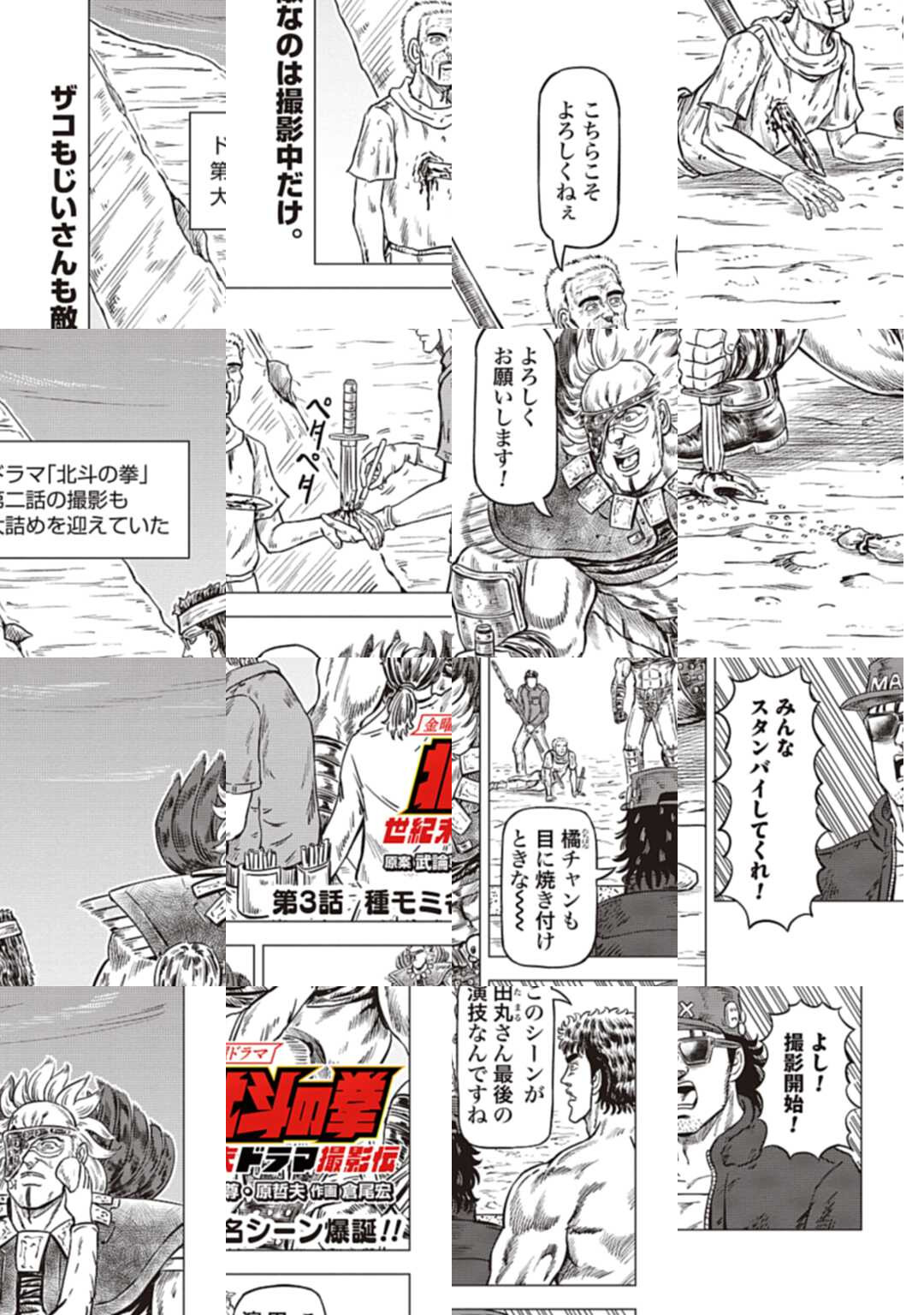 時は世紀末。 海は枯れ、地は裂けた世界。 弱きを傷つける悪に立ち向かう革ジャンの男。 敵を華麗に倒す姿に大きな叫び声が重なる。 「カーーーット!」 枯れた海も、裂けた地も大規模なドラマセット。 これはドラマ『北斗の拳』を日夜撮影する者たちの血と涙と汗の記録。