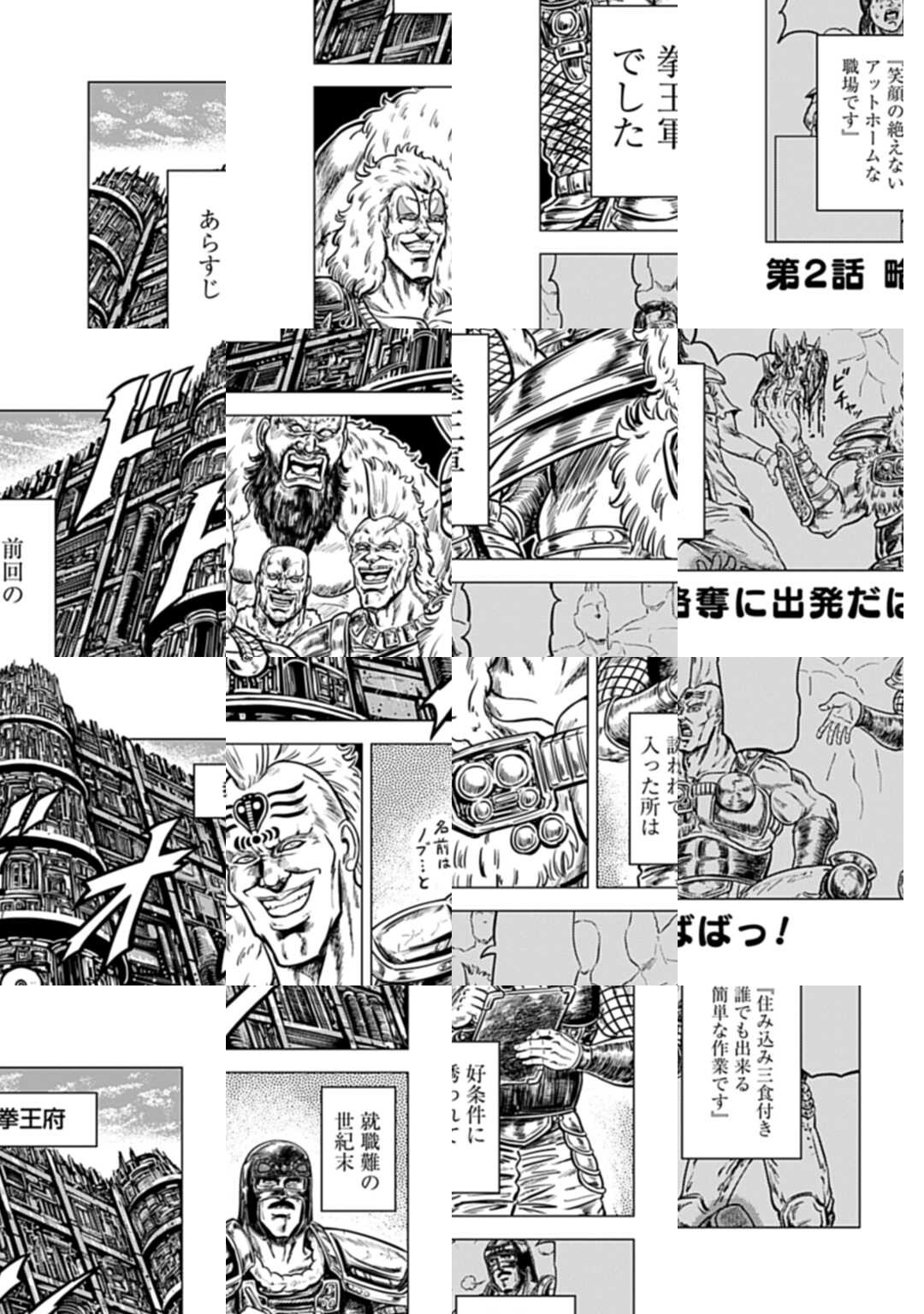 就職先は…拳王軍でした。 199x年。核の炎に包まれた世界は、生きていくだけでも大変な世界。そんな中、主人公ノブが見つけた就職先は、なんとあの「拳王軍」だった!志望者よりも死亡者が多い危険すぎる職場で、ノブはいつまで生きていられるのか…!? ババアに変装したザコや、カサンドラのウイグル獄長、聖帝軍の「汚物は消毒の人」など個性豊かなザコが続々登場!!