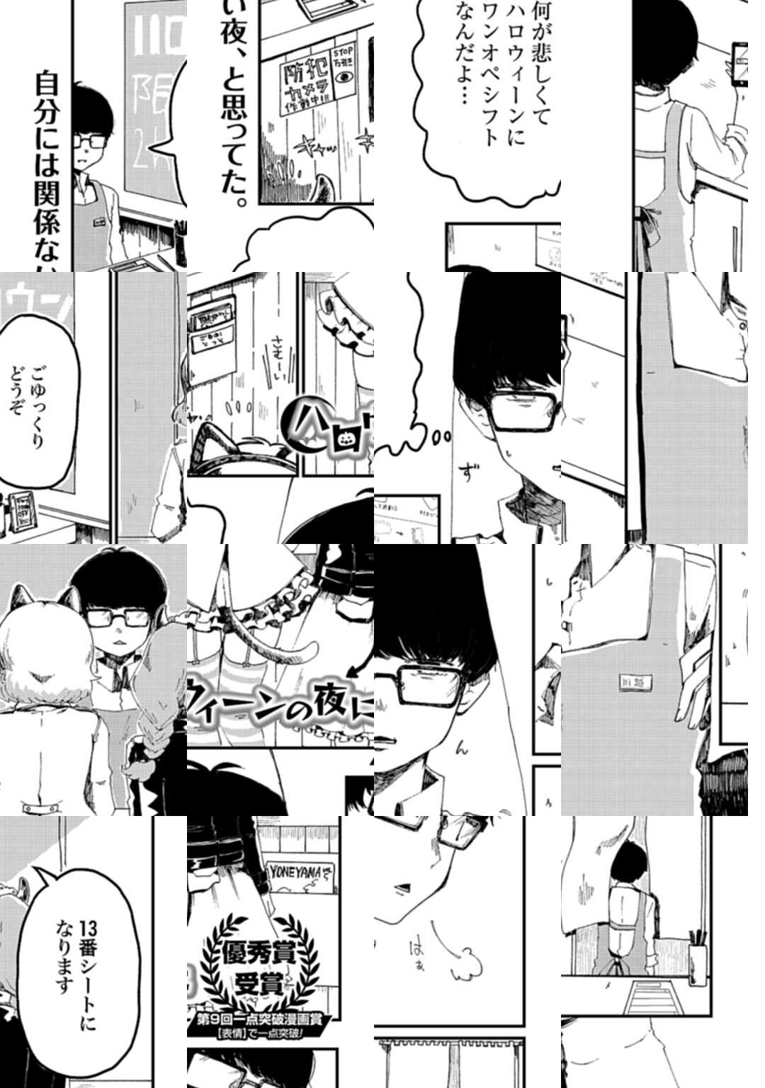 第9回一点突破漫画賞、優秀賞受賞! ハロウィーンの街で、ワンオペバイト中にやってきた強盗との奇妙な夜。なりたい自分ってなんだろう。仮装だらけのハロウィーンの街で、今夜だけ勇気を出して「何か」になってみようか。奇跡が起きる夜をお楽しみください★